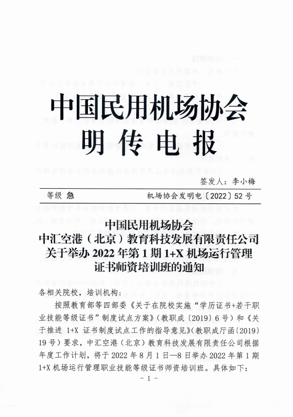 關于舉辦2022年(nián)第1期1+X機(jī)場(chǎng)運行(xíng)管理(lǐ)證書(shū)師(shī)資培訓班的γ(de)通(tōng)知(zhī).pdf